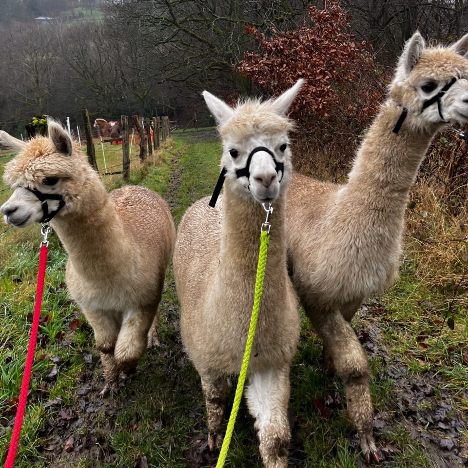 Unsere Alpaka-Wanderungen finden immer mit allen drei Alpakas statt und sind auf maximal 6 Teilnehmer begrenzt.